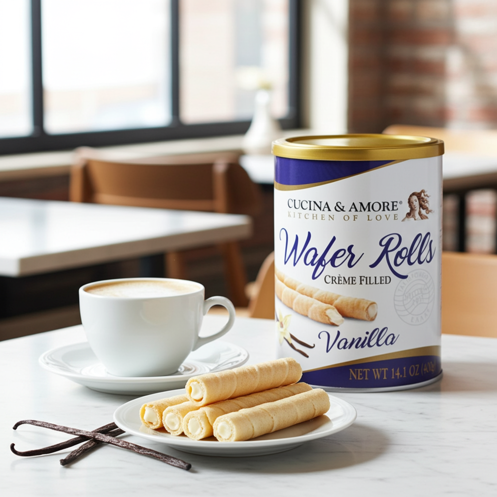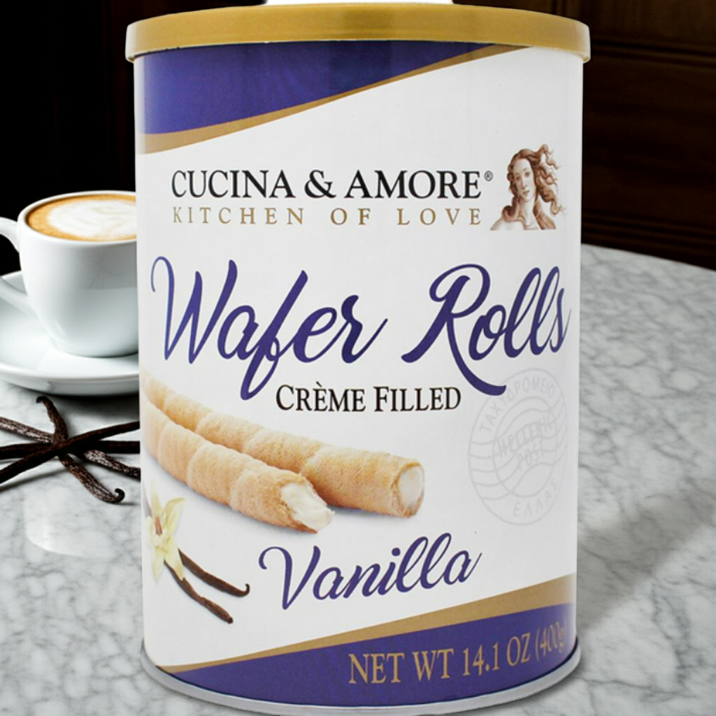 Les gaufrettes roulées à la vanille Cucina & Amore sont des gaufrettes roulées artisanales de style européen, généreusement garnies d'une crème à la vanille riche et savoureuse. Croustillantes à l'extérieur, elles regorgent d'une délicieuse saveur de vanille à l'intérieur. Chaque bouchée fondra en bouche. Ces gaufrettes légères se dégustent aussi bien avec du thé, du café, des desserts, des glaces ou nature.